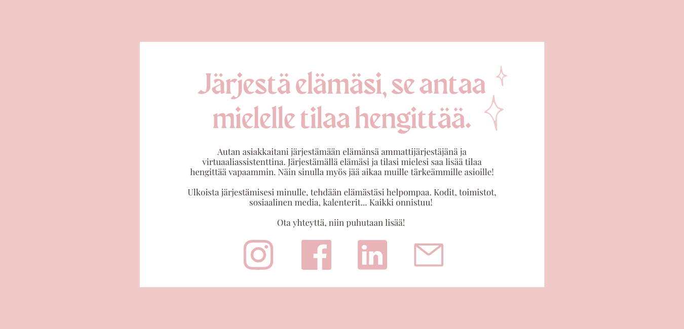 Olen innokas ja luova organisoija, joka lähestyy jokaista projektia yksilöllisesti. Uskon siihen, että jokaisella tavaralla on oma paikkansa – ja että hyvin järjestetty tila tuo mukanaan kevyemmän mielen. Jos kaipaat apua kodin, toimiston tai muun tilan järjestämisessä, olen täällä auttamassa!