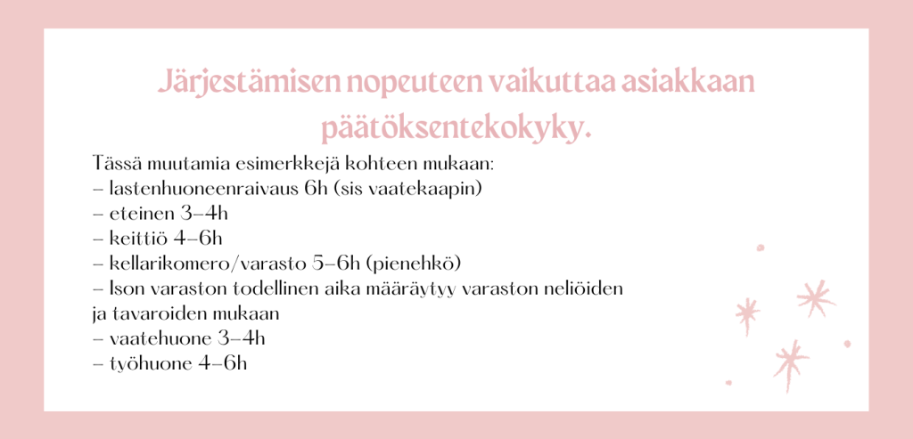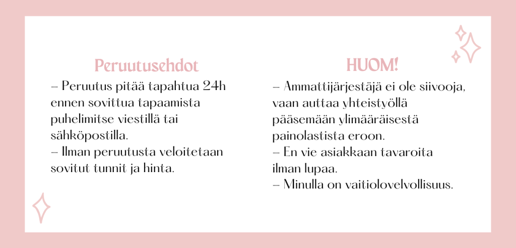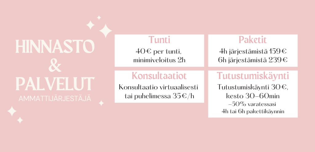 HUOM! Ammattijärjestäjät eivät ole kuitenkaan siivoojia, mutta jotkut tarjoavat myös järjestyksen ohella niitäkin palveluja.